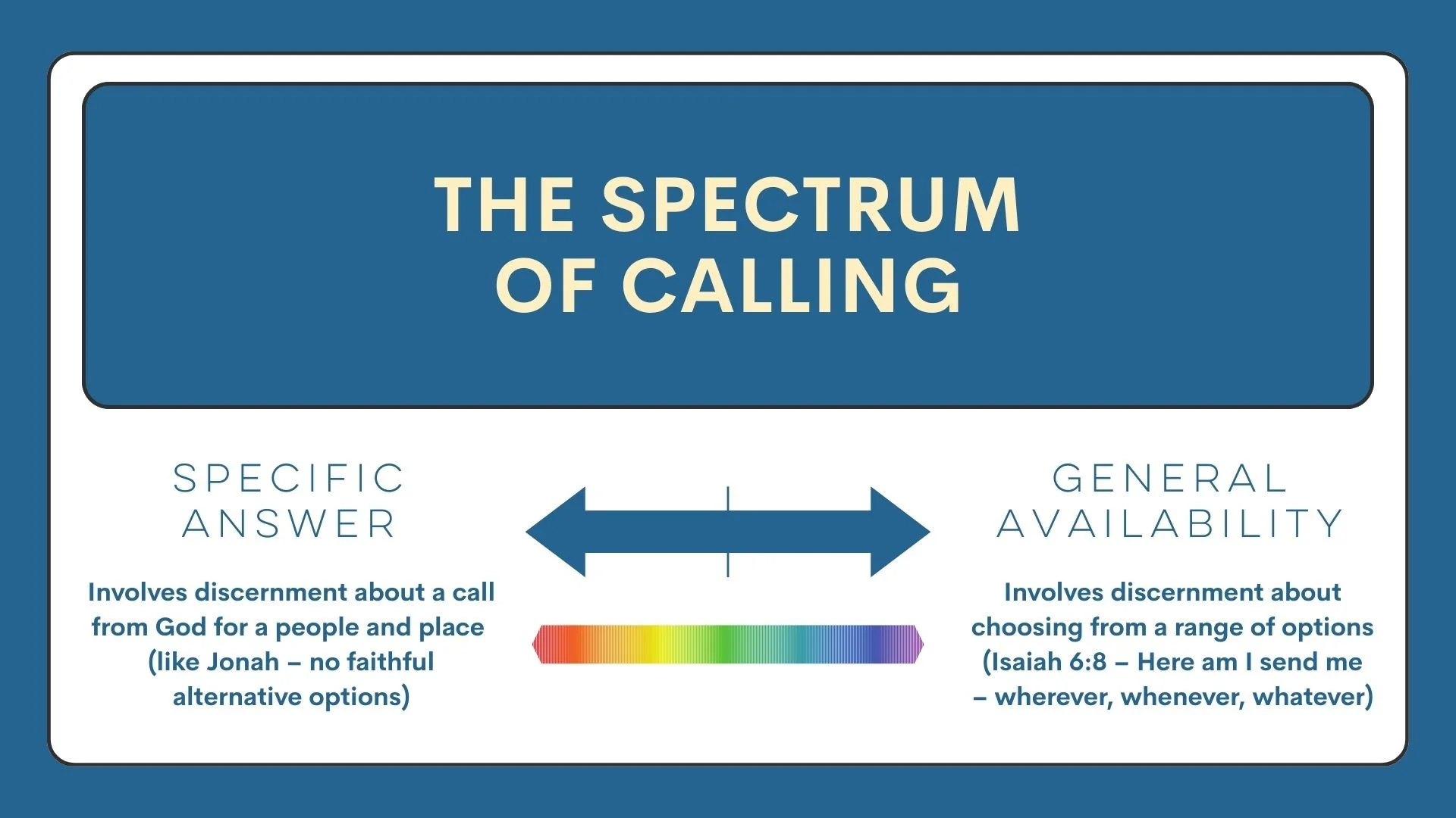 Consider the visible spectrum: there is a range of colors that the human eye can see (and other colors that we cannot!). In a similar way, people who are called to participate in the Mission of God, experience their calling in a range of ways. On one end, there are those who sense that Christ is calling them to a “Specific Answer.” That may be to go to a certain country or people group. Or to serve people from a specific religious background. Or it could be a sense of calling to work with people under a specific form of poverty or oppression. People at this end of the spectrum may end up feeling like Jonah. They were called to something specific, and they see their faithfulness as tied to that one role or outcome. This group will certainly still need to discern details, but the answer to the overall call will be fairly clear and singular.