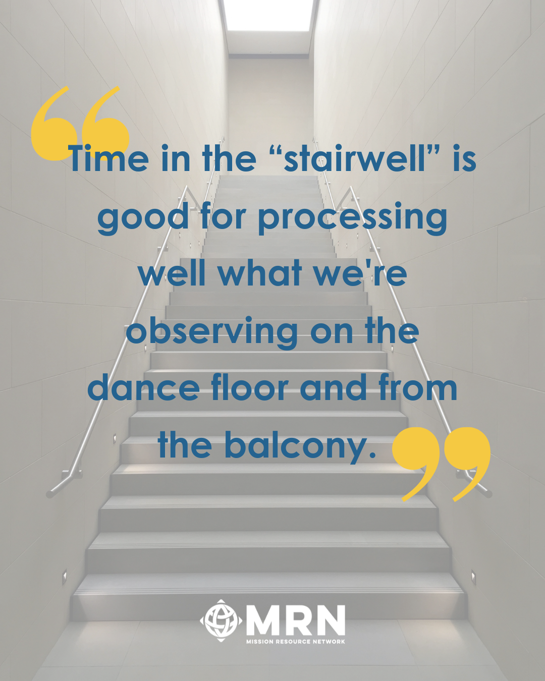 Framing the development of a change process as “balcony work” can cause a team (even with the best of intentions) to spend too much time removed from the dance floor and allow them to come up with ivory tower solutions. Christian missions, churches, companies, and organizations, have certainly made mistakes by spending too much time on the balcony. And we’ve also become so caught up with things on the dance floor that we’ve missed the bigger picture. What we need is to intentionally take the stairs. We need to leverage the stairwell as a liminal, threshold space for processing and diagnosis.
